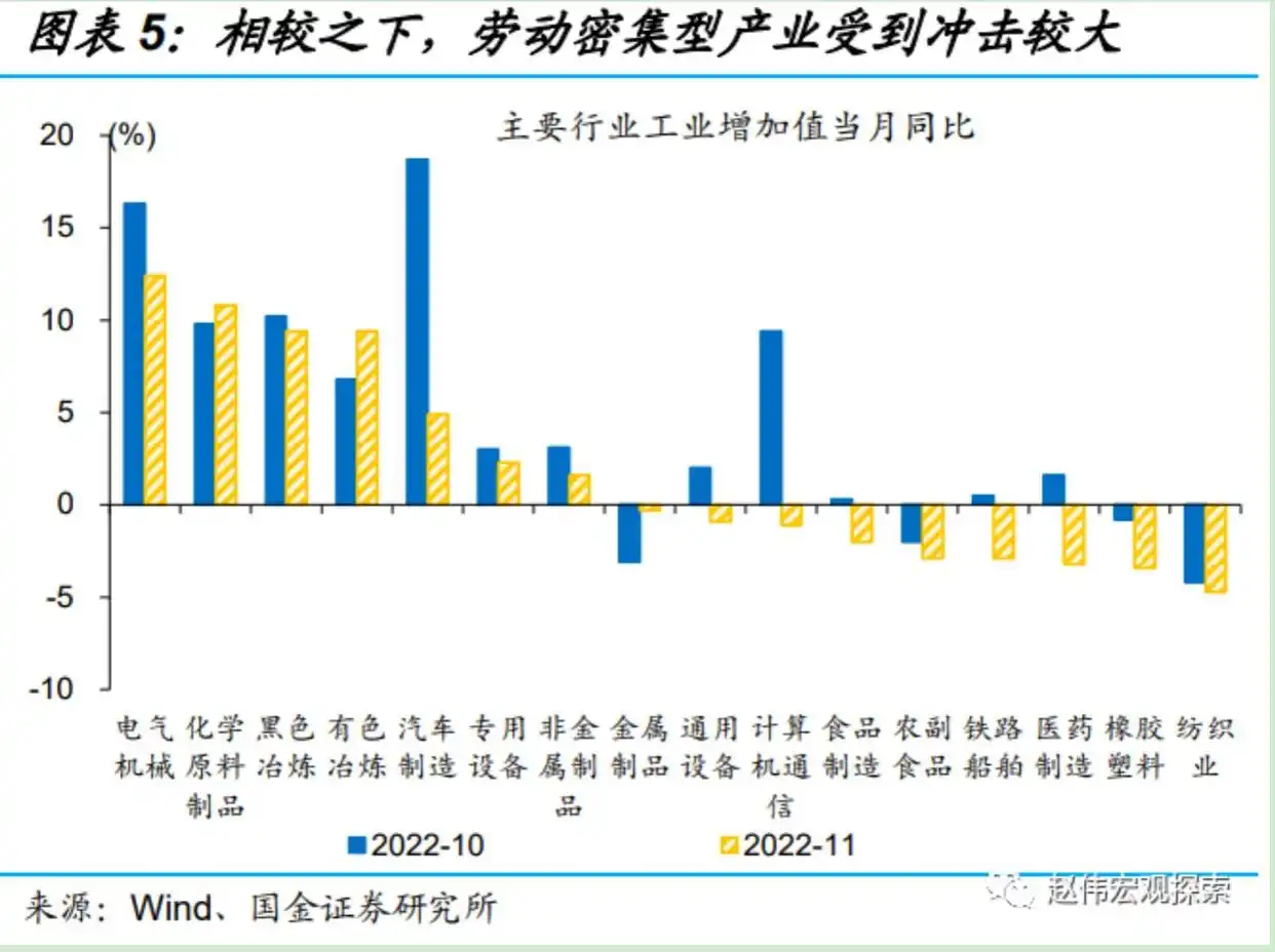 缺少人,制造业的流水线就运转不了,一旦工人感染的面积变得很大,生产线的速度就不得不减缓。11月的数据表明,纺织业增加值与同比相比,下降了4.7个百分点,橡胶塑料下降了3.4,农副食品加工同样下降了2.9。这些行业都是典型的依靠大量劳动力的类型,车间里工人数量众多,只要有一个人请假,就有可能对整条生产线的运行产生影响。