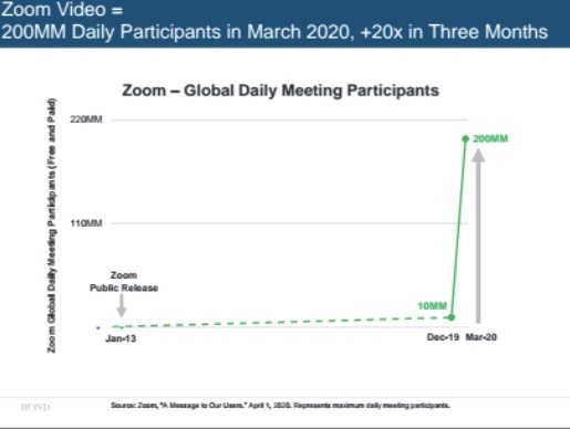 在过去三个月当中,被翻过一番的是Zoom的股价,紧接着,在这个数据的背后,出现的情形是用户量呈现出疯狂般的增长态势。报告里面写着,在3月份,Zoom的全球日活用户的数量达到了2亿人,在短短三个月的时间之内,增长的倍数为20倍。并非仅仅只有Zoom是这样,Slack以及微软所拥有的线上办公工具的流量,均出现了呈现出爆发式的增长情况。