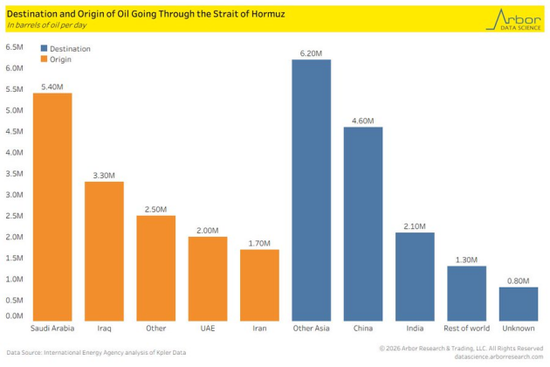 来源国中:沙特540万桶/日,伊拉克330万桶/日,阿联酋200万桶/日,伊朗170万桶/日。