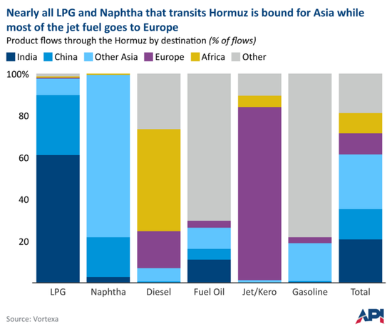 经由霍尔木兹海峡的化工原料中LPG、石脑油主要是至日韩、中国、印度等,硬约束比较大,尤其是对日韩原料依赖度高,储备少的蒸汽裂解装置,将更加脆弱。