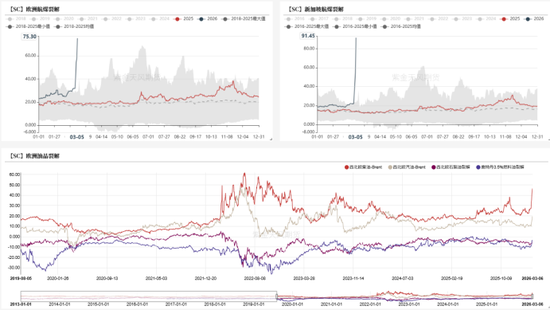 霍尔木兹海峡的油品中,柴油、航煤主要是去往欧洲方向,参考俄乌期间,柴油已接近俄乌期间的水平。航煤裂解远超历史高位。
