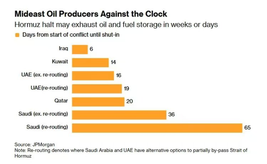 根据JPMorgan,若发生供应中断,伊拉克仓储仅维持6天,目前伊拉克油田已出现停产;UAE\Qatar等维持14-20天左右;沙特能维持36天以上。