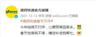 在2021年12月中旬起始之时,德邦快递便率先发出了“第一阵枪响”,宣告2022年春节阶段将会持续维持不歇运的状态。紧接着跟随着,顺丰也展示出了连续15年全年都不存在休息情况的记录,自2008年一直到2022年,服务从来都没有出现过中断。