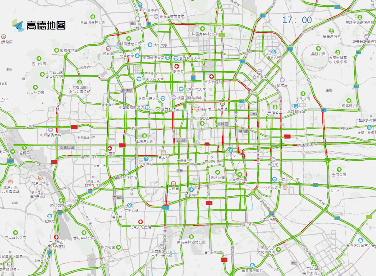 早上处于高峰时段,从7时30分开始一直到9时,在西直门北大街那里以及德胜门外大街朝着进京方向,菜户营南路还有通惠河北路,并且包括京藏、京承高速的进京收费站区域,车辆行驶得十分缓慢。到了周一的早高峰情况就更为严重,送学车流跟通勤车流相互叠加,部分环路匝道入口很容易就会排起长长的队伍。